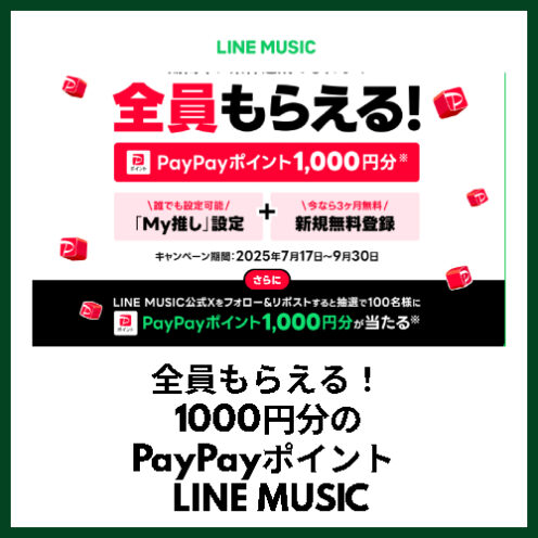 アプリ LINE MUSIC 全員もらえる! 1000円分の PayPayポイント キャンペーン概要 全員もらえるPayPayキャンペーン | LINE MUSIC(公式) 期間中にLINE MUSICをダウンロード 新規無料登録&「My推し」設定で PayPayポイント1,000円分がもれなく全員... 2025.09.21 アプリキャンペーン